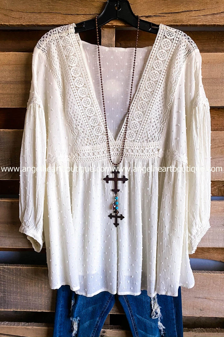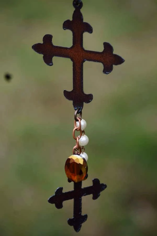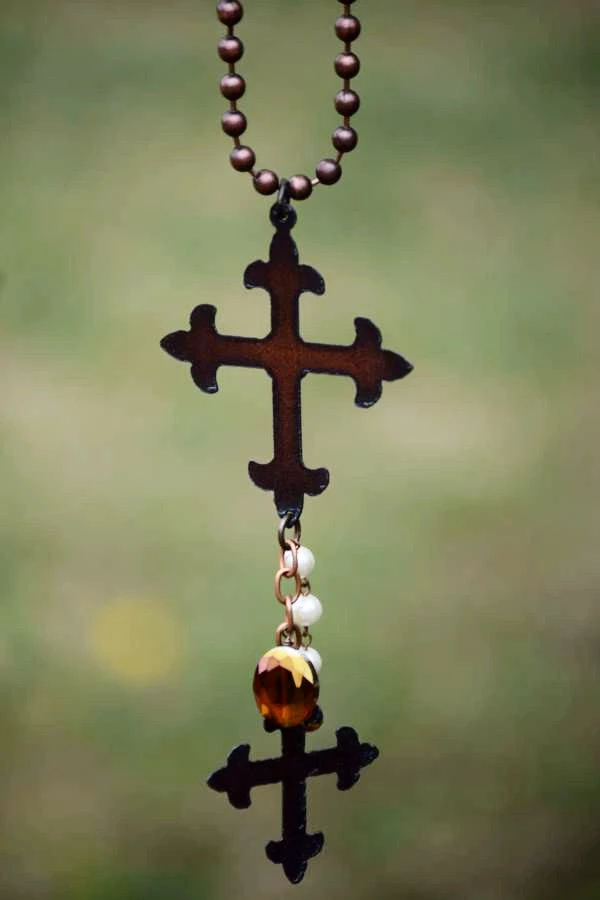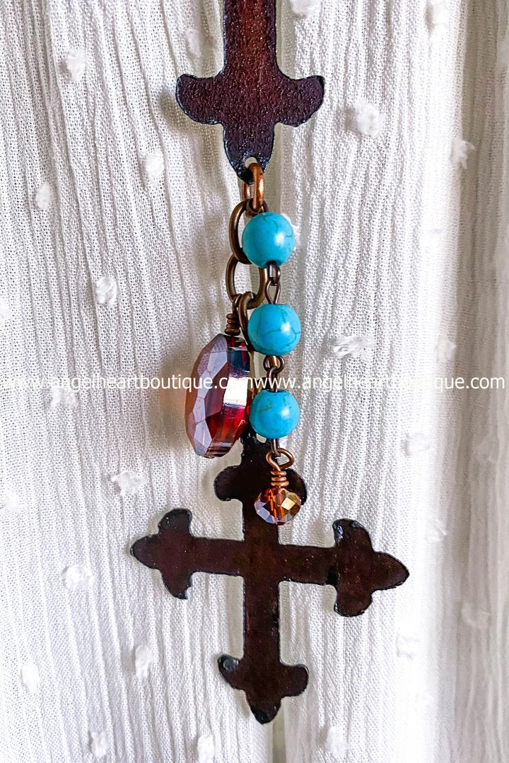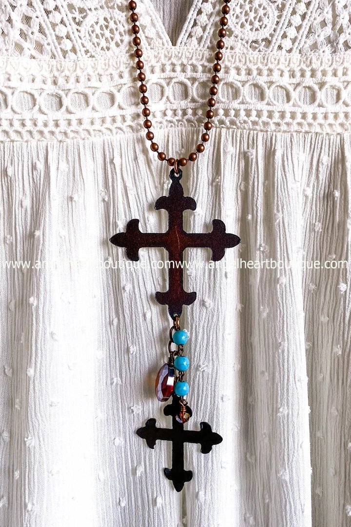 A double cross necklace brass color with hanging turquoise beadsÂ